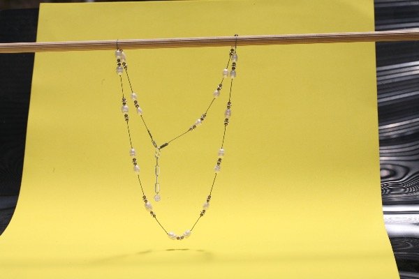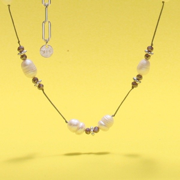 Este delicado collar combina elegancia y sutileza en un diseño único. Está confeccionado con un fino hilo de seda que asegura suavidad y flexibilidad, adornado con cristales brillantes que aportan luminosidad. Las perlas naturales, cuidadosamente seleccionadas, añaden un toque de distinción y sofisticación, reflejando su belleza orgánica. Ideal para ocasiones especiales o para complementar un look cotidiano con estilo, este accesorio es una expresión de femineidad y buen gusto.