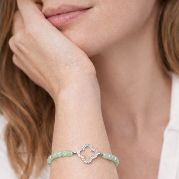 Delicada Pulsera de Trébol de 4 hojas. Se dice que cada hoja representa la fe, la esperanza, el amor y la suerte. Con cristales Checos. Es ajustable a todas las medidas.