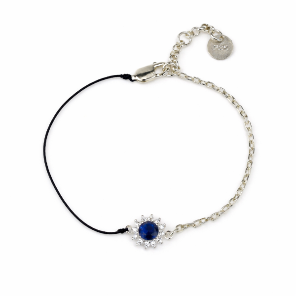 Pulsera de filo azul y cadena de plata 925. Hermoso dije de plata 925 con zirconia azul. Color que se asocia a la sinceridad, la inspiración, la espiritualidad y la fuerza mental.